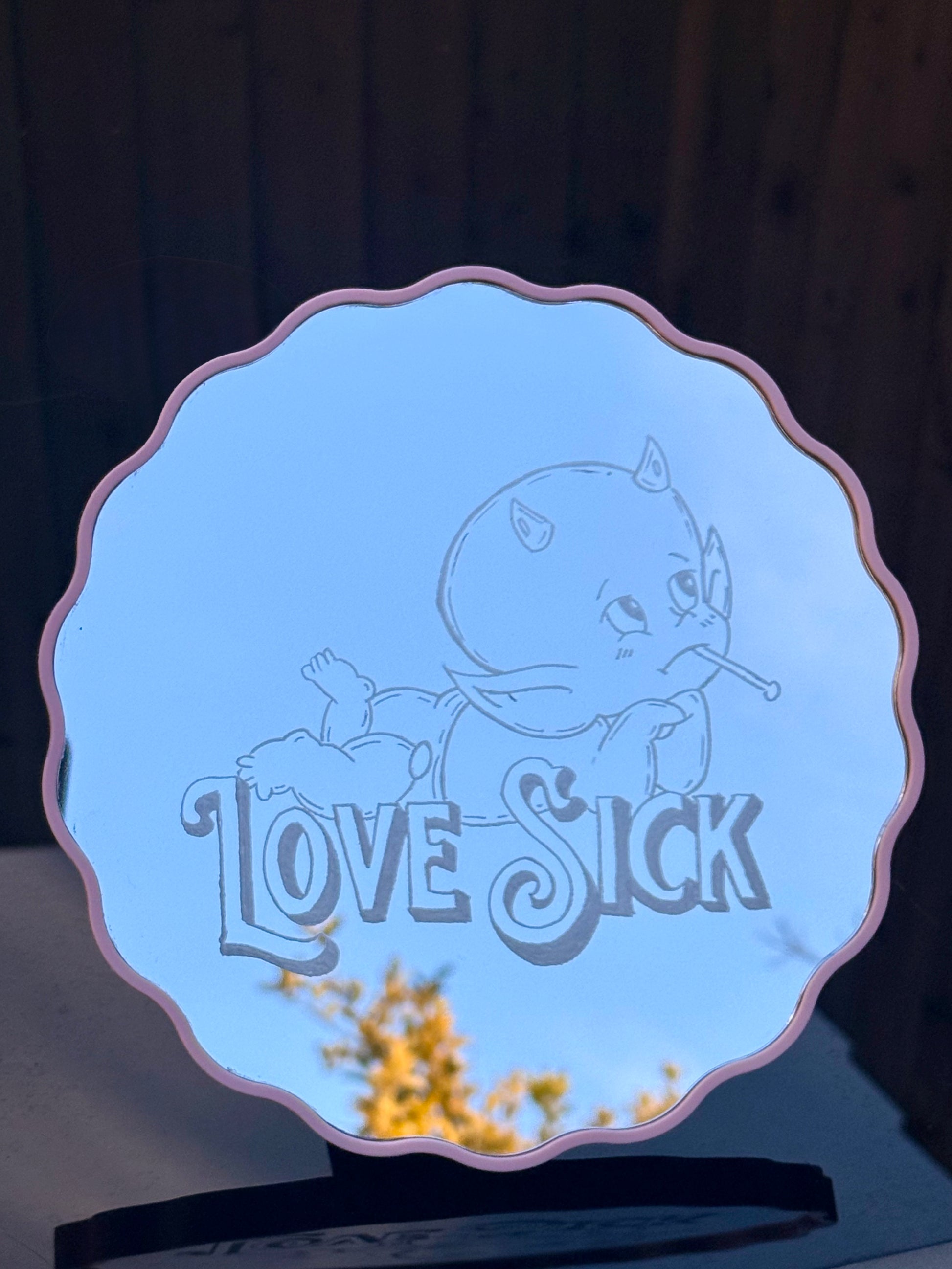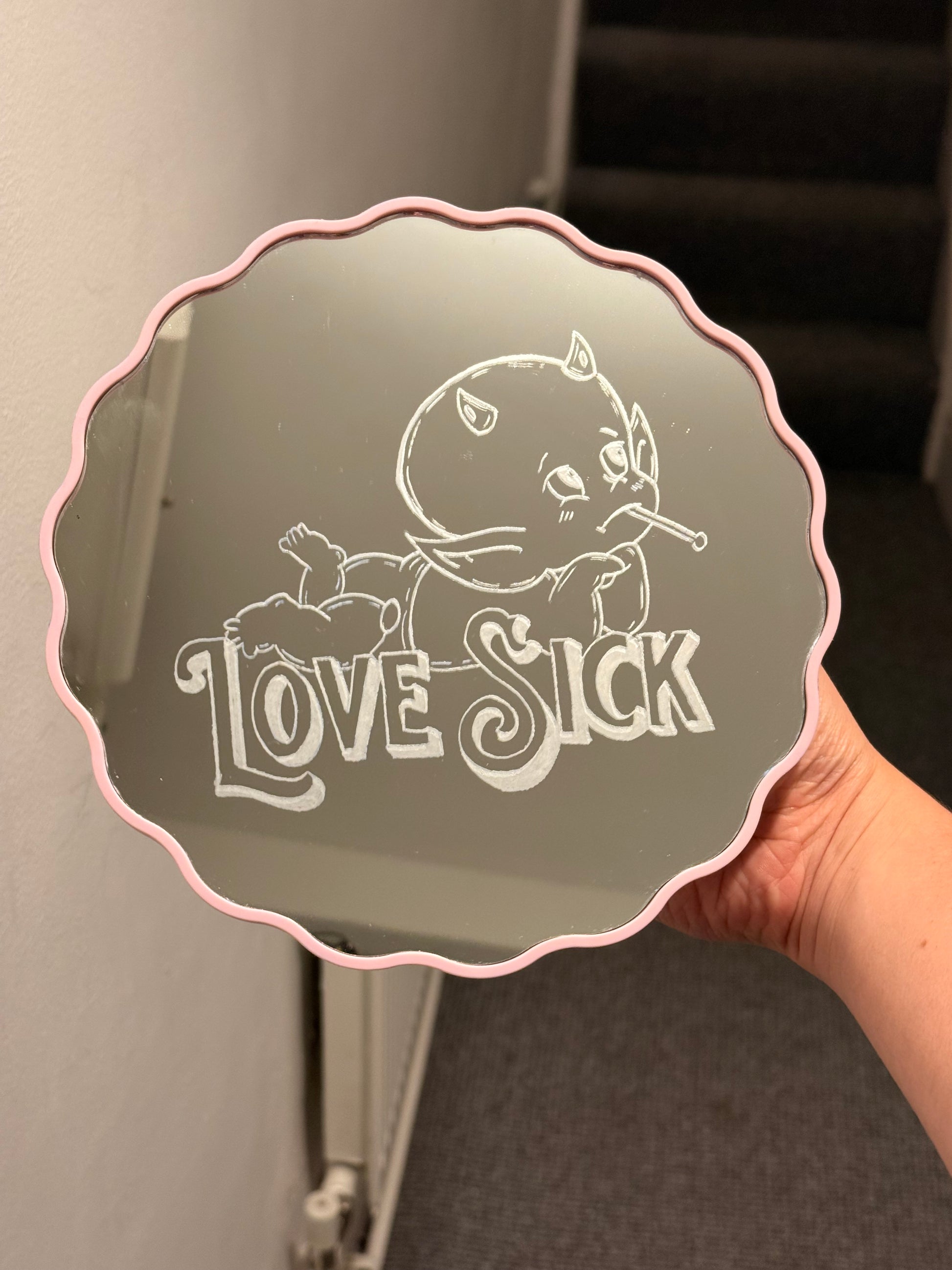 Love Sick Table Mirror, a playful alternative accent for your home! Hand engraved with love, perfect for a valentine’s gift, or as home decor.