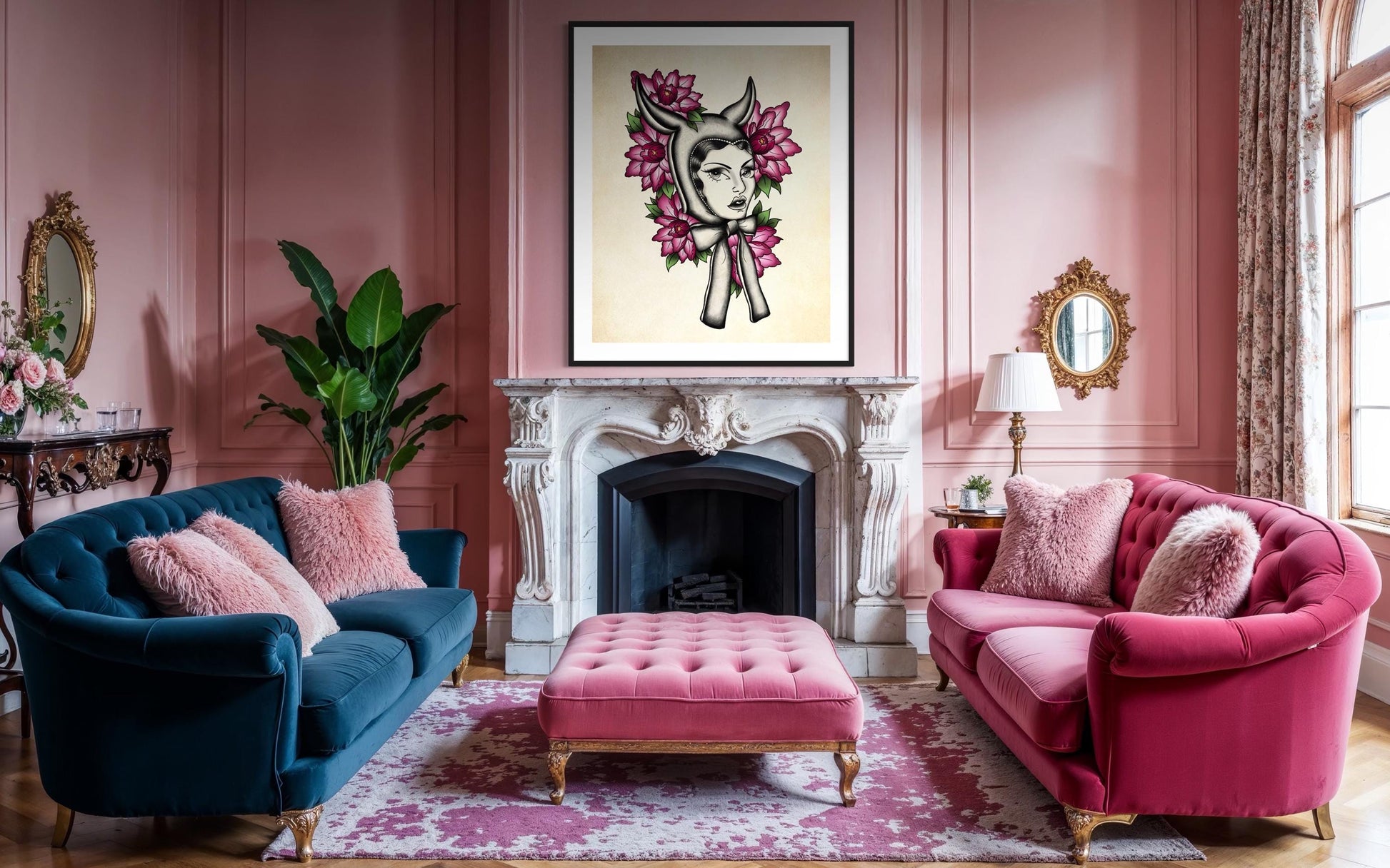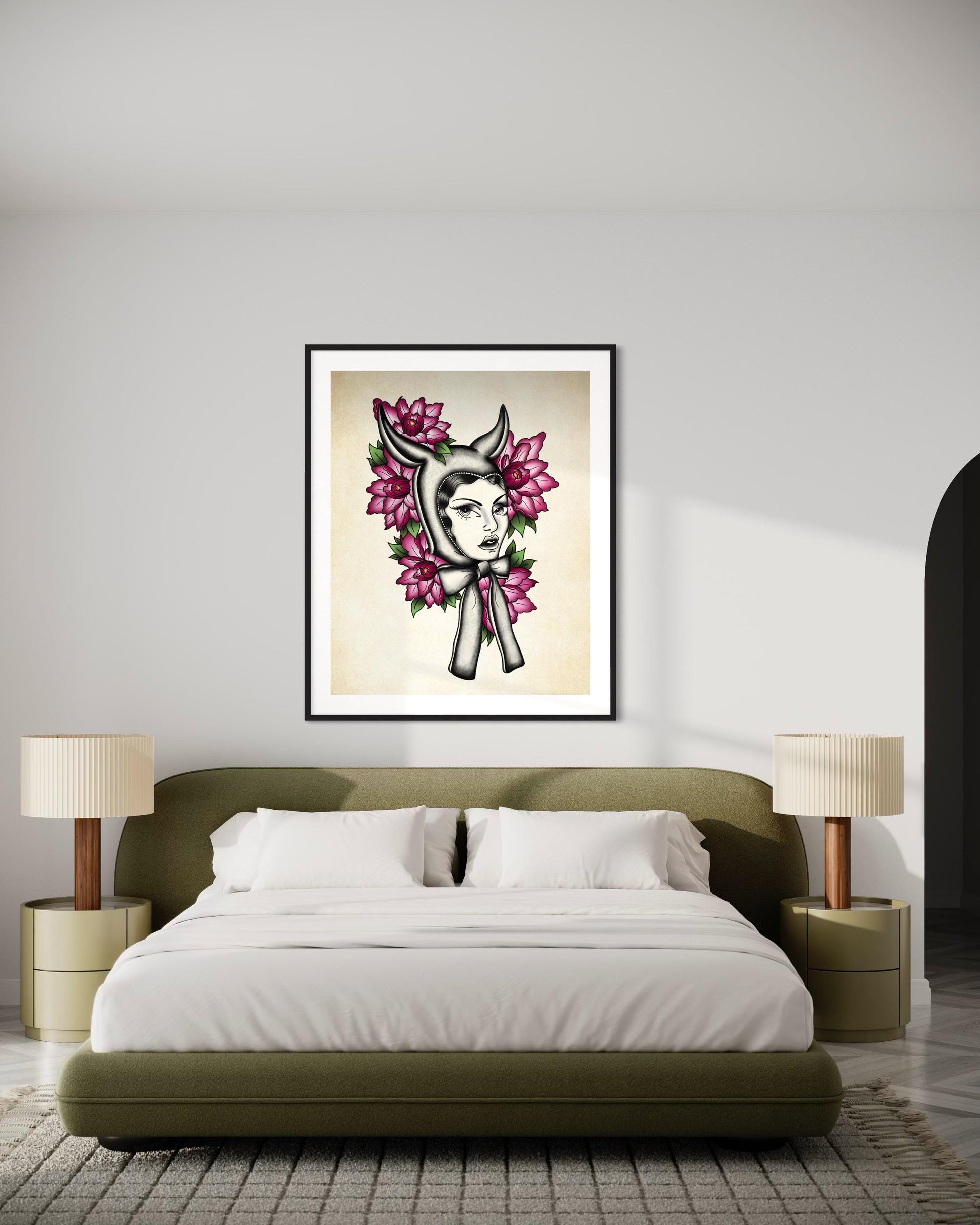 Neo Traditional Tattoo Poster – Devil Pinup with Peonies Print (Digital Print)